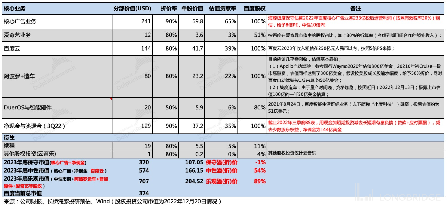 剔除 2022 年三季度末的净现金规模(=现金 + 短期投资 - 长短期有息负债 - 少数股东权益,并给予 90% 折价)129 亿美金,剩下 246 亿美金。假设完全不考虑百度云、阿波罗及造车业务未来可能带来的增量价值,对应海豚君估算的 2023 年百度核心广告(不含爱奇艺)税后运营利润 233 亿元人民币,仅为 7x PE,低于一般中性预期下的估值倍数 10~12x。
