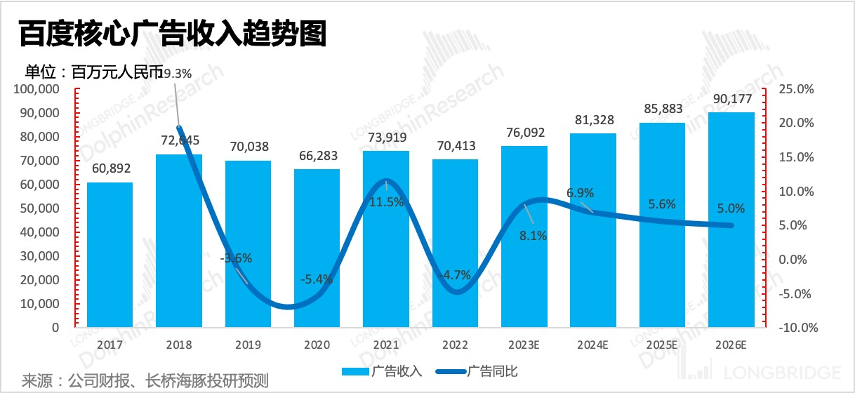 尽管明年下半年大概率将显著恢复经济活动,对照目前彭博一致预期,海豚君发现,市场对于 2023 年百度核心广告的回暖增速预期并不算积极(~yoy 5%),略低于我们的预期(~yoy 8%,比照 2021 年相对 2020 年的修复幅度)。
