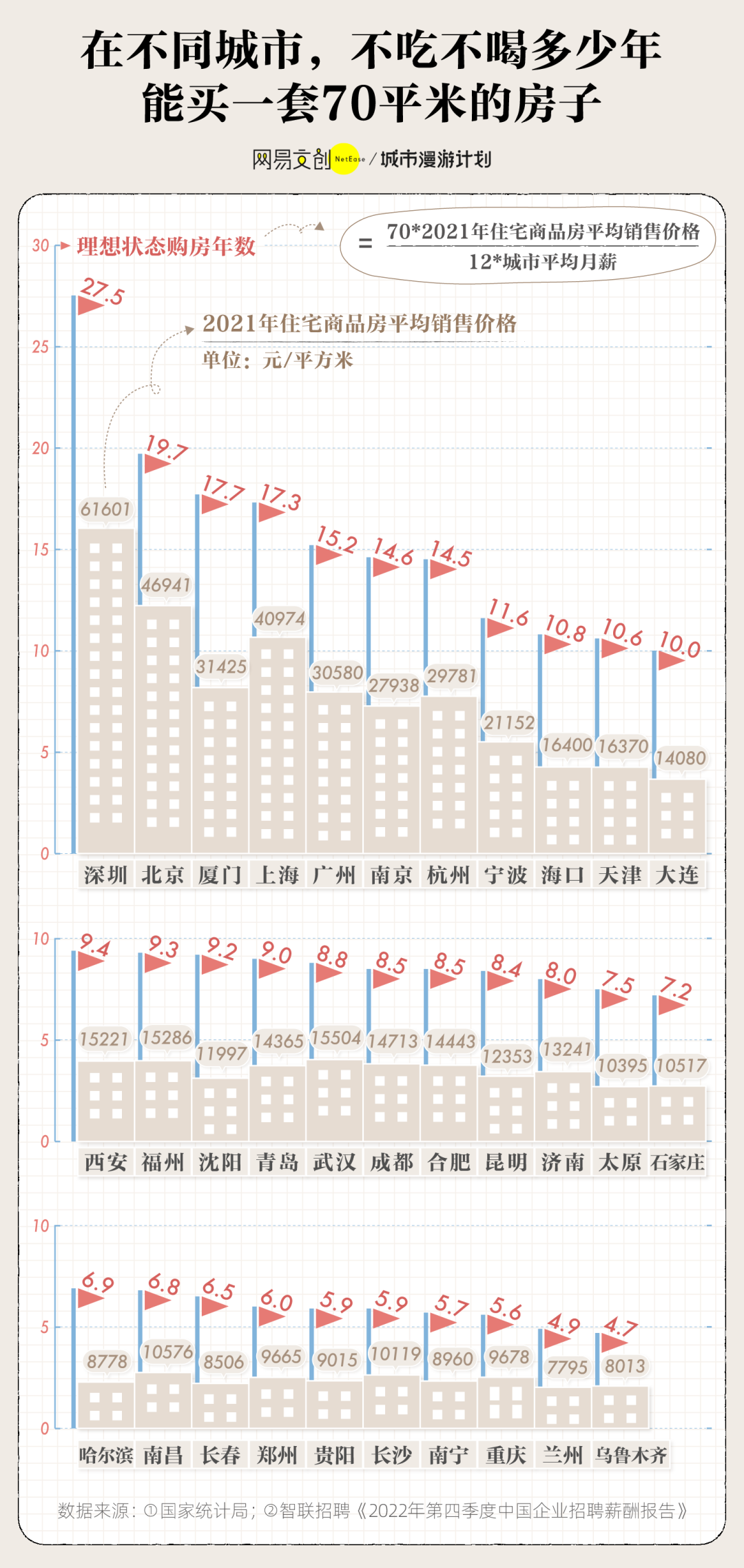 还是以上面智联招聘发布的薪酬数据为例,假设一个打工人不吃不喝,想在厦门买下一套普通地段70平米的房子,就要将近18年。而在上文中提到的,在薪酬和工作机会更有优势的杭州,住房负担也很重。