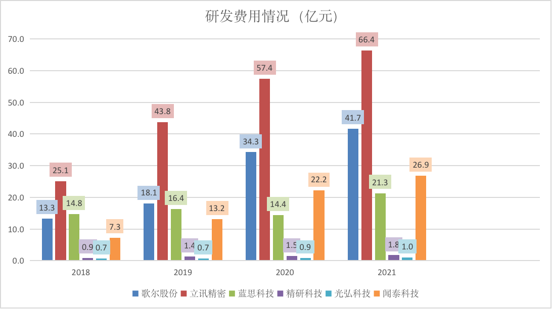 在布局新业务的同时,各公司的研发费用也均出现上涨。其中,歌尔股份加大对AR/VR设备、可穿戴设备及智能家居的研发投入,研发费用同比上升21.7%。蓝思科技则加大对消费电子和新能源汽车等领域的研发,研发费用较2020年增长48.0%,达到21.3亿。