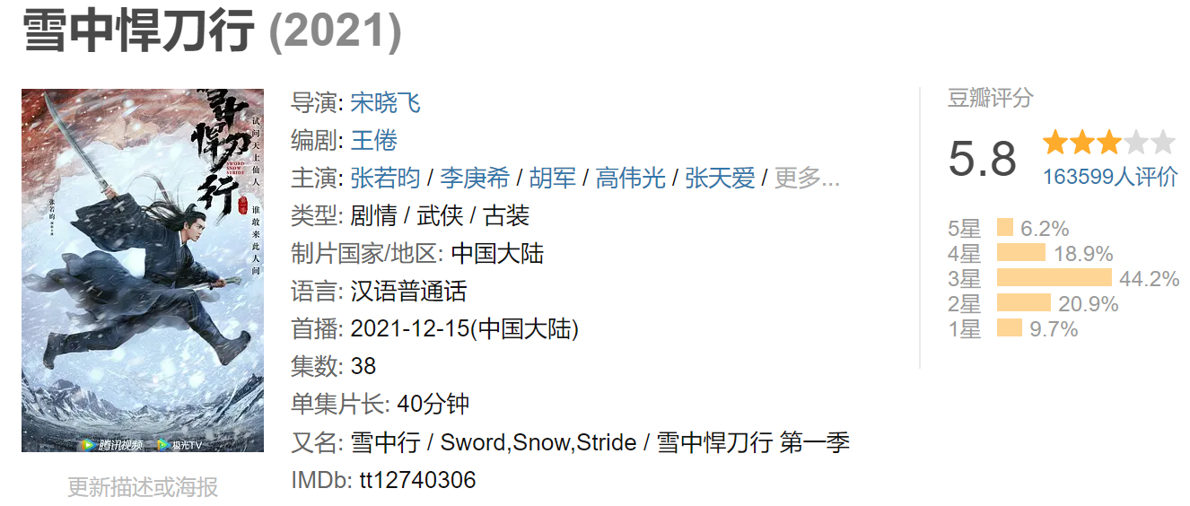小说2016年上线、电视剧2021年上线的《雪中悍刀行》,口碑则差了很多。电视剧版《雪中悍刀行》与《庆余年》都是由知名编剧王倦改编,主演都是张若昀,还有一众相同的演员班底,但《雪中悍刀行》豆瓣评分仅5.8,小说读者骂声一片。