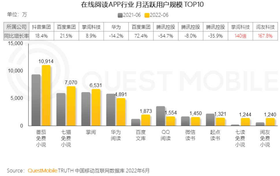 先看用户。财报显示,阅文旗下平台平均月活即MAU从2021年的2.32亿,增长到了2022年上半年的2.64亿。调研机构QuestMobile数据则显示,2022年6月在线阅读APP行业月活规模TOP10榜单上,阅文尽管占得两席,但QQ阅读、起点读书同比2021年6月陡降54.7%和35.9%,仅分别以1554万、1321万,位列第六和第八名,这与强劲增长中的以10914万排在首位的番茄免费小说和以7070万位列第二名的七猫免费小说差距越拉越大。