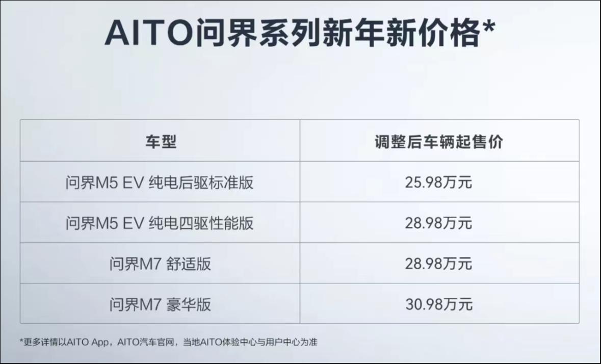 进入2023年后,问界曾打出降价促销方案,试图挽救开始下降的销量。1月13日,问界宣布M5 EV和M7开始降价,降价幅度为2.88至3万元。问界也是继特斯拉1月6日宣布降价以来,第一个跟进的自主品牌。但1月和2月的销量证明,问界采取的以价换量措施并没有奏效。