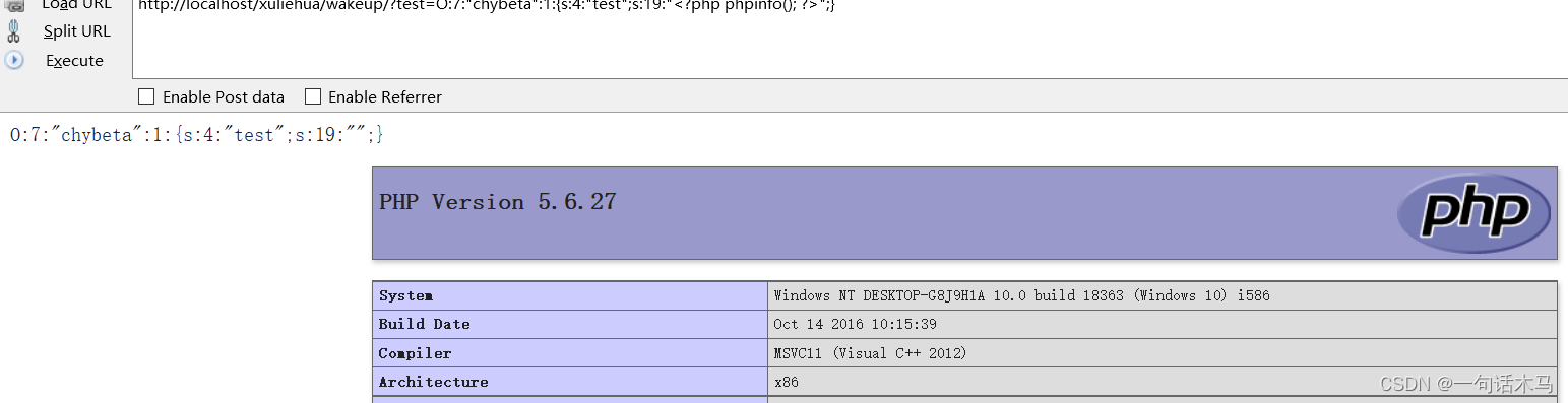 传入参数:?test=O:7:"chybeta":1:{s:4:"test";s:19:"<?php phpinfo(); ?>";}