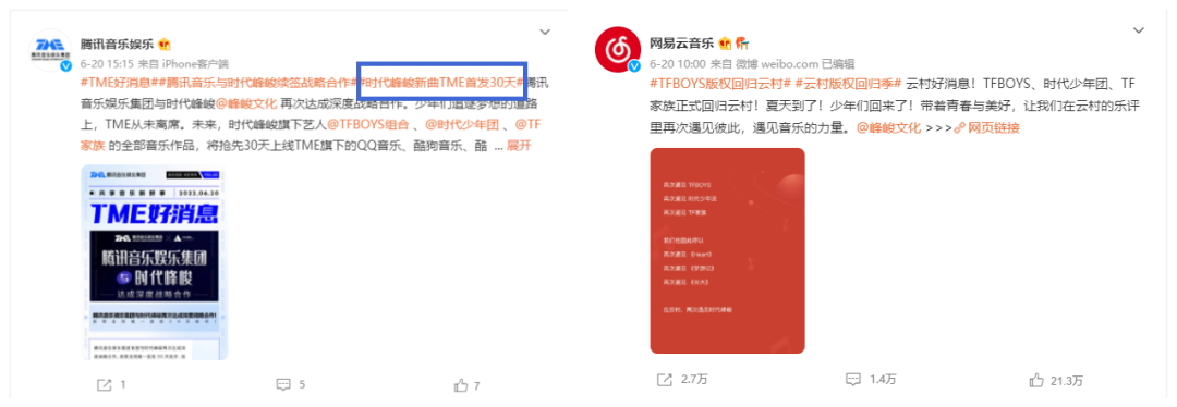 6月20日,网易云音乐、腾讯音乐娱乐集团(以下简称TME)先后官宣与时代峰峻达成版权合作。在6月初,SM娱乐也先后与两大音乐平台达成了版权合作。
