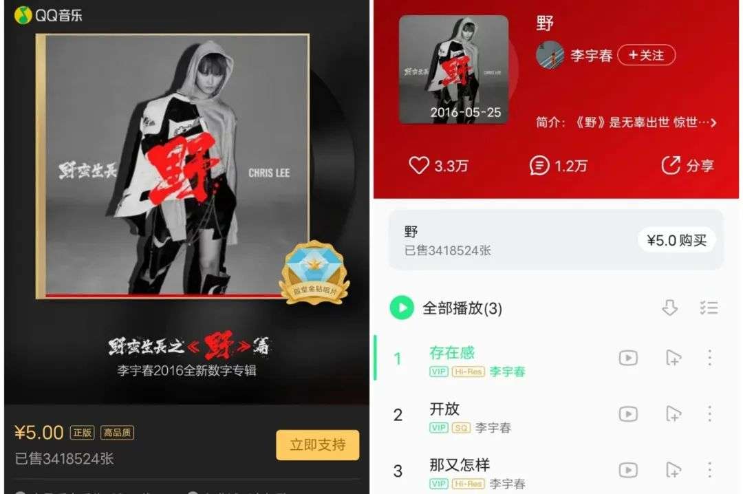 拿QQ音乐举例,2016年5月到11月之间,李宇春经由QQ音乐发行了四张数字专辑《野》、《蛮》、《生》、《长》,如今这几张专辑已经开放给平台会员收听。