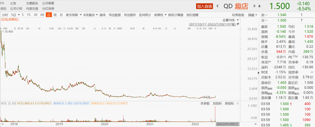 早在今年2月和5月,趣店收到了纽交发出的不合规通知函,原因是其美国存托股份(ADS)平均收盘价在连续30个交易日内低于1美元,趣店需要在六个月的时间恢复符合最低股价要求。