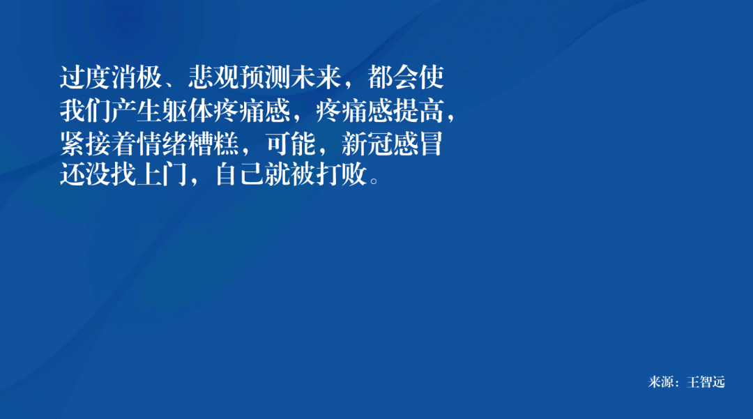 过度消极、悲观预测未来,都会使我们产生躯体疼痛感,疼痛感提高,紧接着情绪糟糕,可能新冠感冒还没找上门,自己就被打败。