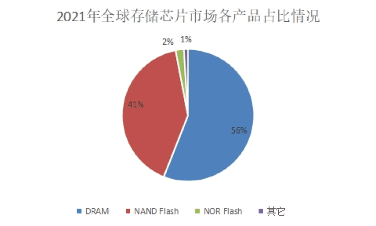 不过,在全球存储芯片市场中,NOR Flash占比较小。全球主流存储芯片主要有存储芯片DRAM、和闪存芯片NAND Flash和NOR Flash三种类型。根据IC Insights数据,2021年,全球NOR Flash芯片市场规模仅占全球存储芯片产值的2%,而DRAM和NAND Flash产值占比能达到56%和41%。