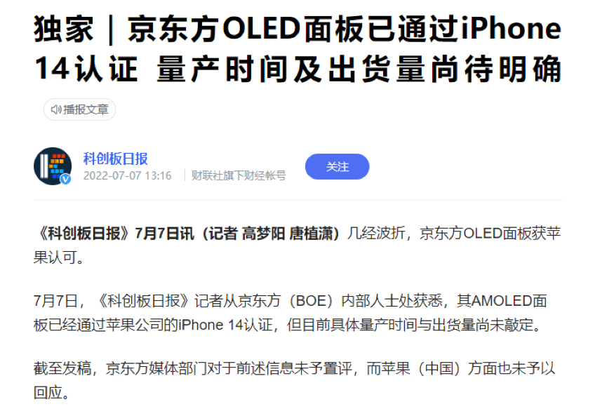 今年5月,一则关于京东方被踢出果链的谣言一石惊起千层浪。韩媒The Elec报道,在发现京东方擅自更改iPhone13设定的屏幕设计(薄膜晶体管的电路宽度)后,苹果正考虑取消授予京东方的多达3000万块iPhone 14 OLED屏幕订单。但这篇报道出来之后,京东方内部工作人员便否认了该消息,而苹果方面也澄清:不太可能会将京东方剔除OLED屏幕的供应链。