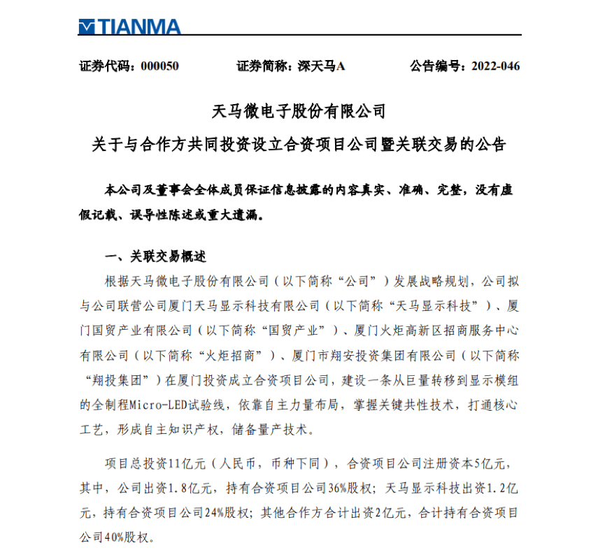 此外,苹果正在加速推进新一代显示技术MicroLED的开发,投资3.3亿美元给LED 生产商晶元光电和液晶面板制造商友达光电在中国台湾建厂生产未来iPhone、iPad、MacBook等设备的MicroLED显示屏。为了抓住新一代显示技术的发展机遇,打破日韩企业多年在电子显示屏市场的垄断局面,天马微电子(深天马A)在今年6月发布公告称,拟与联营公司天马显示科技、国贸产业、火炬招商、翔投集团在厦门投资成立合资项目公司,总投资11亿元,建设一条从巨量转移到显示模组的全制程MicroLED试验线。