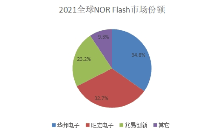 根据IC Insight数据显示,2021年全球 NOR Flash 市场呈现出寡头垄断格局,绝大部分市场份额由华邦电子、旺宏电子、兆易创新三家大厂占据,华邦电子和旺宏电子均来自中国台湾。其中兆易创新的市场份额为23.2%,排名第三,但其销量增速明显高于前两名。