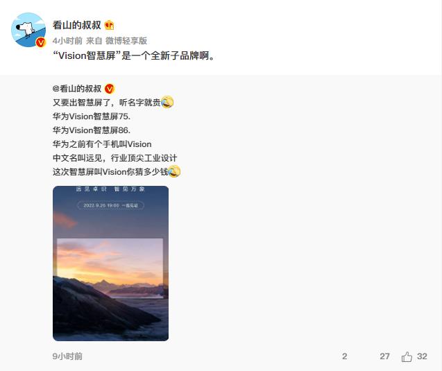 但根据市场调查机构显示,今年上半年国内电视市场的市场份额Top4为海信、TCL、创维以及小米,且只有这四家企业的市场份额超过了10%.而华为智慧屏的市场份额甚至没能进入Top 10。或许是为了去解决这个困境,华为上架了一款“智慧屏全新子品牌新品”,根据业内人士透露的信息来看,华为的全新子品牌名叫Vision(中文名为远见),将于9月26日正式开售。