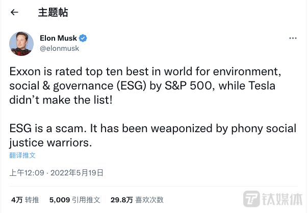 其中,在特斯拉被踢出标普ESG指数后,特斯拉CEO、前世界首富埃隆·马斯克发推文怒斥称,ESG就是骗局,它被那些伪装成社会正义斗士的家伙当成枪使。