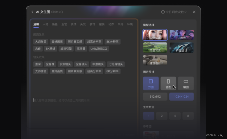 9类提示词:在Pixso AI点击输入窗口,就会呈现通用、人物、无关、表情、头发、装饰、服装、环境、建筑等9大提示词,帮你快速锁定灵感。