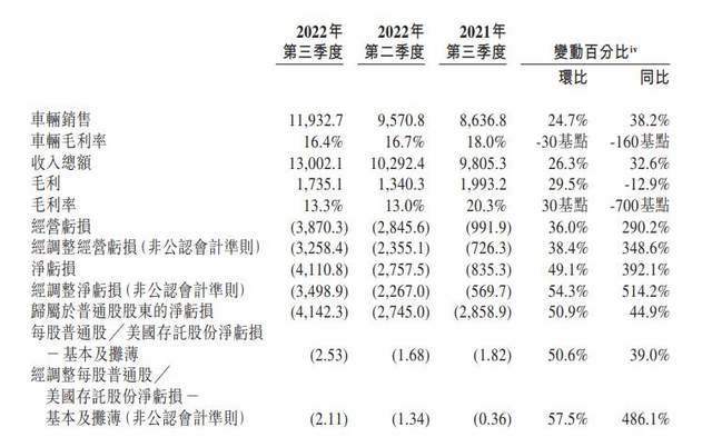 营收增加,亏损进一步扩大。蔚来三季度净亏损41.1亿元,与上年同期相比增亏392.1%,与上一季度相比增亏49.1%。相当于每卖一辆赔13万元。