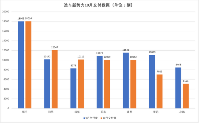 10月,蔚来的交付量排到了第四名。理想交付量比蔚来少卖了7辆车,位列第五名。小鹏汽车销量腰斩,跌到第七名。哪吒、问界、极氪销量排前三。
