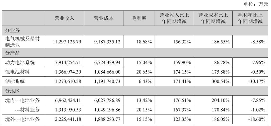 根据2022年半年报显示,动力电池系统营收达791亿元,占营收的70%;锂电池材料营收达137亿,占营收的12%;储能系统达127亿元,占营收的11%。