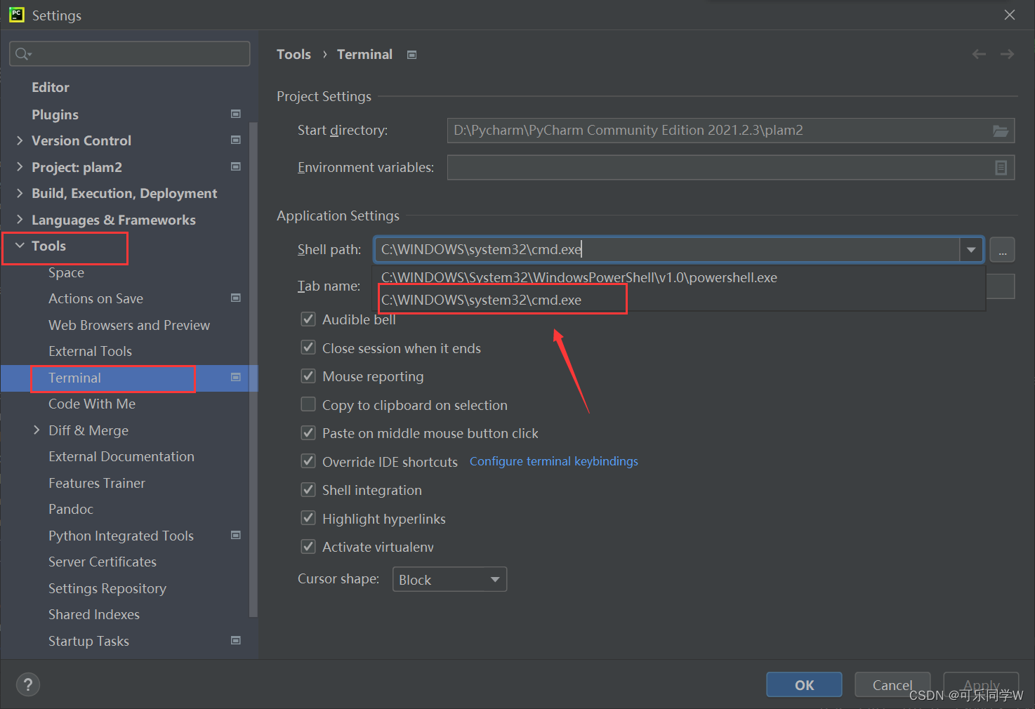 step2:进入setting后,选择Tools中的Terminal,并在Tab name中将地址位置修改为如图所示。