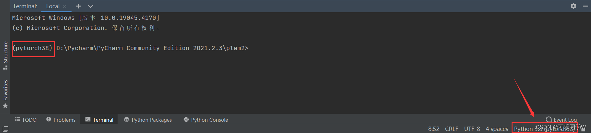 方法一:直接在pycharm中修改环境,重新进入终端即可自动进入所选的虚拟环境。