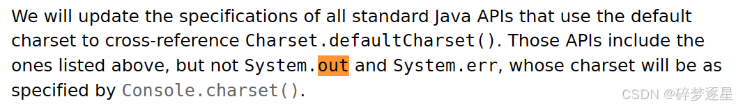 再说回控制台输出流,JEP400提到大部分API都转换成了Charset.defaultCharset字符集,也就是UTF-8。BUT,out和err流被排除在外,他们的字符集将被**Console.charset()**确定,同时也指出,JDK18并没有支持这三个参数设置(实际上可以设定)实际上直到JDK 19 才将这两个参数正式作为新特性添加,默认他们是依赖于平台的,当平台没有提供控制台的流时,将根据 native.encoding(GBK)编码。