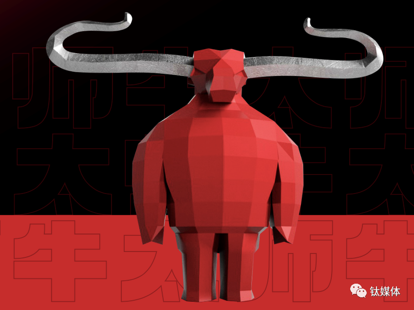 牛钛师突出、别致和极具金属力量感的犄角形状,与身体构成了一横一竖的清晰轮廓,还形成了钛媒体LOGO的“T”字。