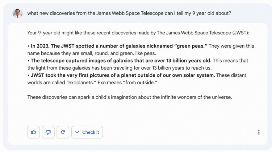 谷歌演示了一个使用Bard来简化复杂主题的例子,比如向 9 岁的孩子解释 NASA James Webb 太空望远镜的新发现。