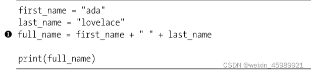 Python使用加号( + )来合并字符串。在这个示例中,我们使用 + 来合并 first_name 、空格和