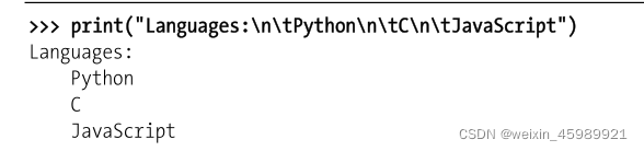 还可在同一个字符串中同时包含制表符和换行符。字符串 "\n\t" 让Python换到下一行,并在