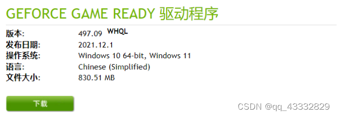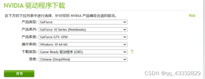 得知以上的信息以后我们就可以对应我们的显卡去英伟达官网上去找相对应的显卡驱动更新或者下载了。显卡驱动的下载网址NVIDIA 驱动程序下载https://www.nvidia.cn/Download/index.aspx?lang=cn