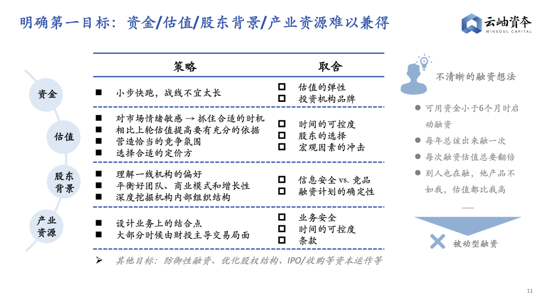 常见的目标有“快速拿到资金”、“获得更好的估值定价”、“提升股东背景”、“引入产业资源”等,但往往这些目标是很难兼得的,最终我们会紧紧围绕“第一目标”去排兵布阵,为了目标的达成,不可避免会有一些取舍。