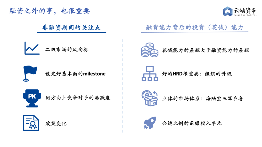 在非融资期间,企业的“雷达”是不能关的,既要清楚地设定达到下一个融资周期的业务milestone,也要时刻对二级市场的风向标,竞品的活跃度、政策的变化保持高度敏感,动态地去更新融资节奏。