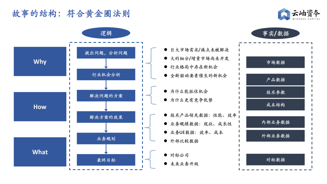 首先故事的结构应该符合沟通中的“黄金圈法则”,依次讲清楚: