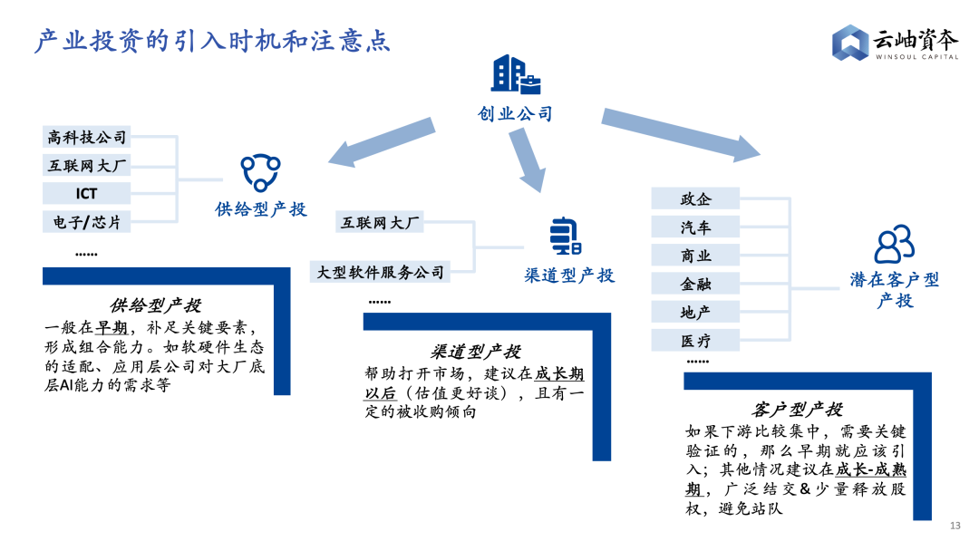 我们可以把产投分为三类,一类是**“供给型”**,对公司的价值是补足关键要素(如半导体公司软硬件生态的适配、大厂的AI能力加持等),形成完整的组合能力。