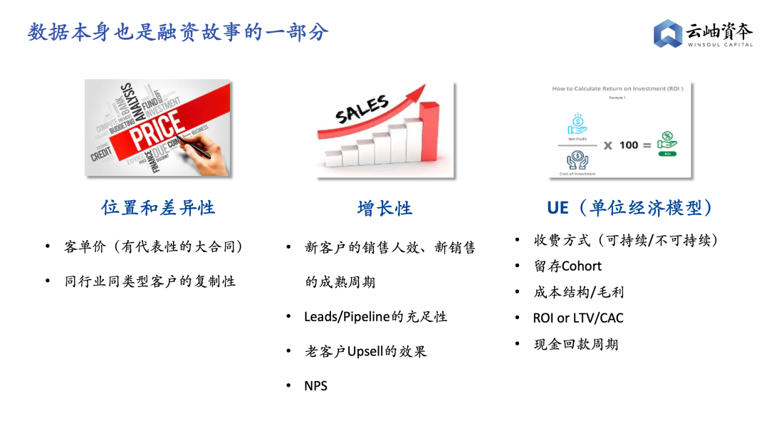 其实数据本身就是融资故事的平行线,投资人做决策前,会从数据的多个维度去验证你的行业位置、增长性和UE,我们强烈建议在正式开始见投资人之前就把所有的数据包都准备好,提前预知其中的问题。