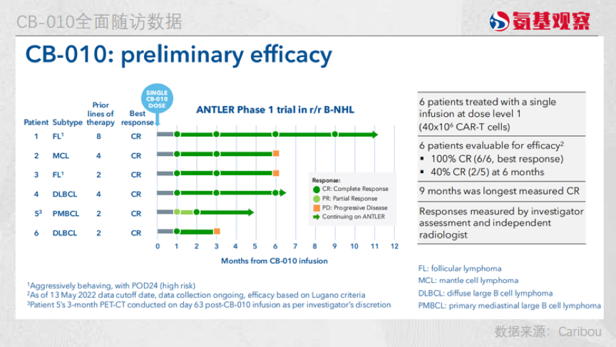 根据Caribou披露的数据,共有6名患者参与CB-010的试验。在给药初期,这些患者的症状均有所缓解,ORR达100%,完全缓解率(CR)达83.3%(n=5/6)。