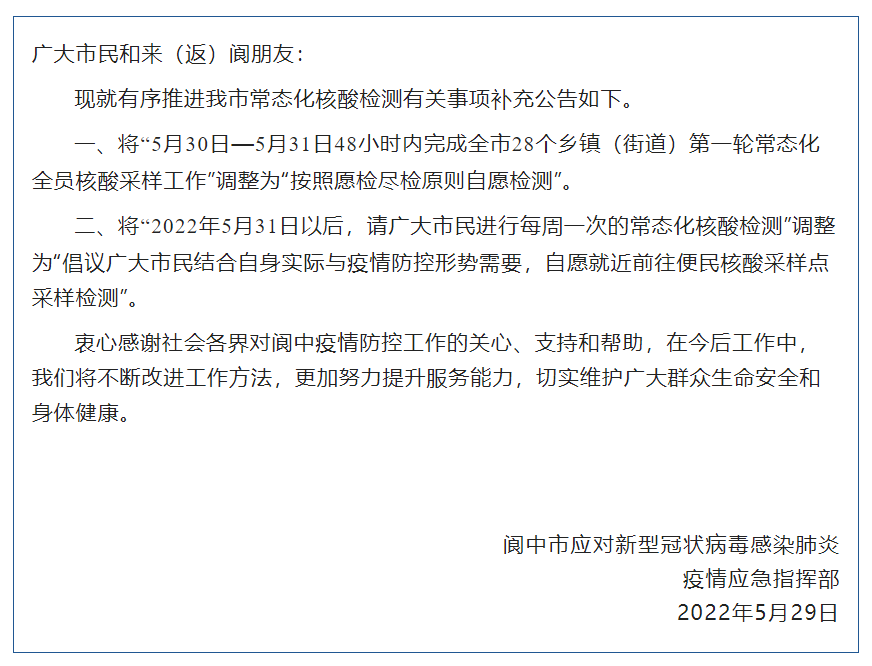 5月底,四川阆中市在官方微信发布一则通知,自5月31日后,广大市民在公布的便民核酸采样点自觉自费进行每周一次的常态化核酸检测。