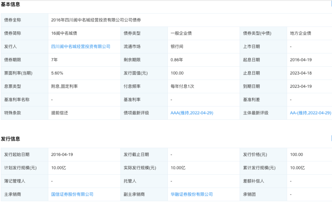 就在月前,中证鹏元发布公告,决定维持四川阆中名城经营投资有限公司主体信用等级为“AA-”,将评级展望由稳定调整为负面。