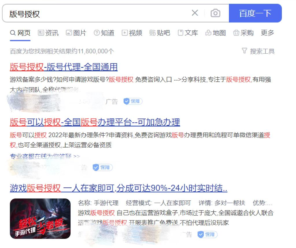 如今在各大搜索引擎、百度贴吧甚至闲鱼等平台搜索关键字“版号授权”,仍能找到各类从事版号买卖业务的中介机构信息。我们搜索发现,在平台上投放了广告的机构网站中,部分网站虽注册公司及网页信息不同,但实际运营人员则为同一批人。而在他们的网站底部合作伙伴中,赫然列着多家知名游戏企业。