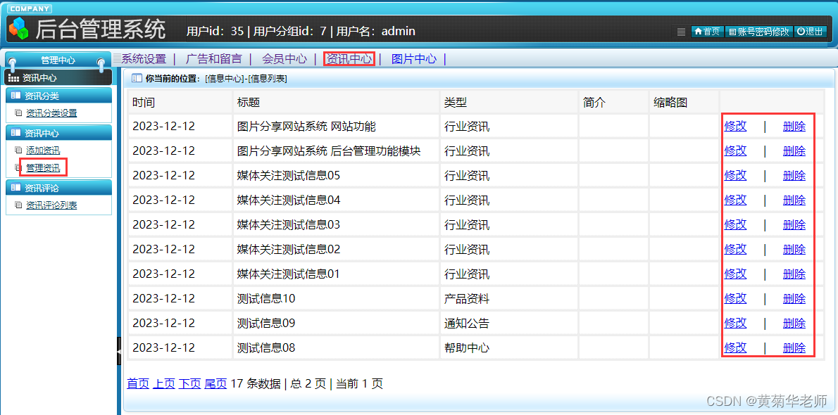 管理资讯:查看已录入资讯列表,支持删除和修改
