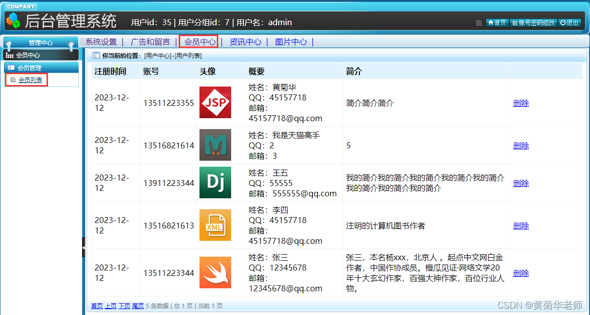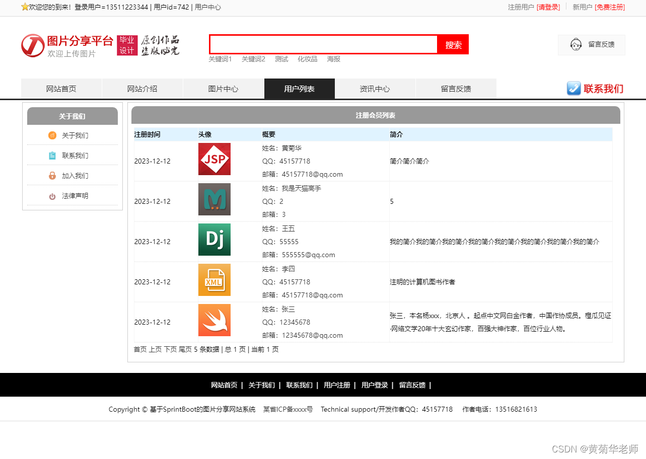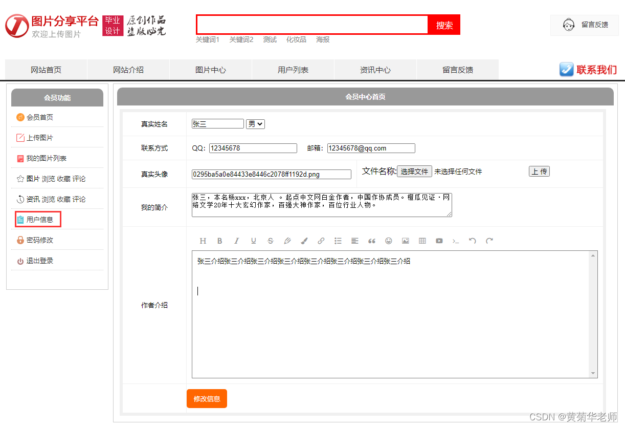 用户信息:姓名、联系方式、邮箱、头像、简介、介绍等,支持随时修改;用户注册的信息后台管理员可见;后台管理员可以删除