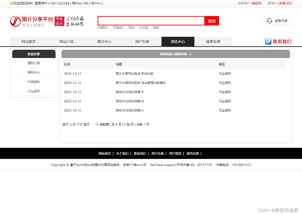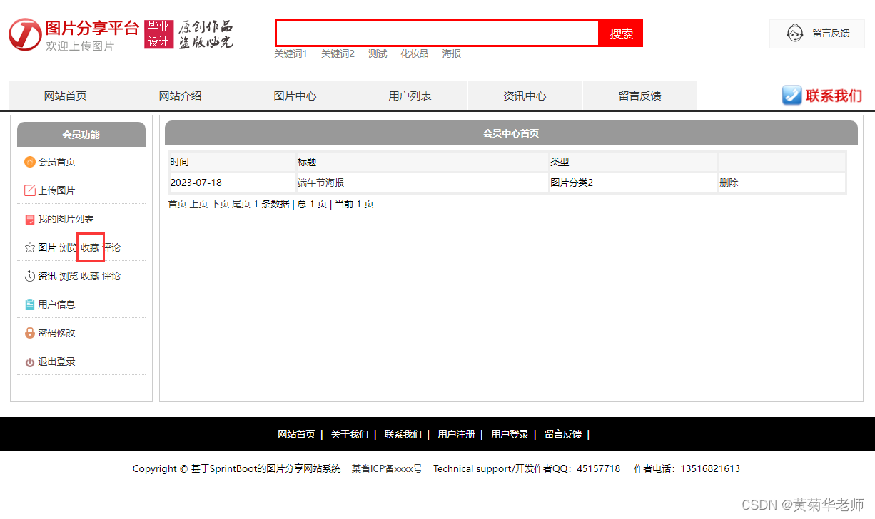 图片上传:注册登录后的用户,在用户中心可以上传图片,选择分类、填写标题、是否对外分享、上传图片、填写图片详情。