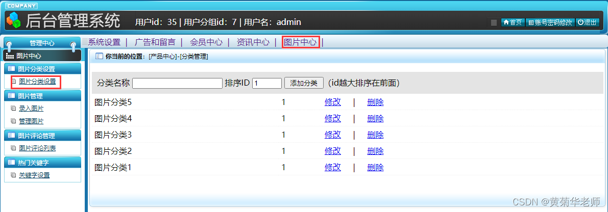 图片分类设置:设置图片分类信息,供用户上传的时候选择分类;支持修改和删除