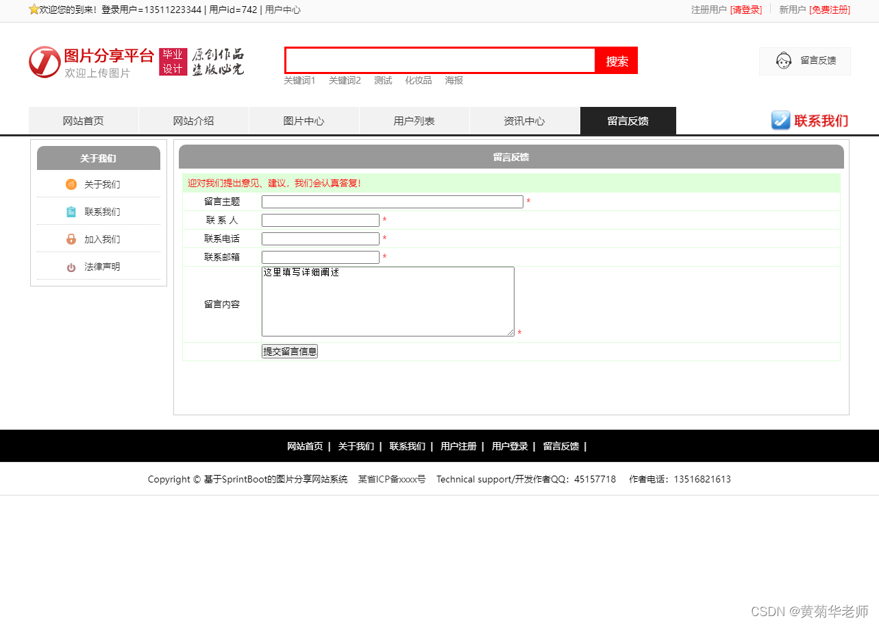留言反馈:用户填写李哭咽的主题、联系人、电话、邮箱、留言内容;后台管理可以查看留言列表,可以删除留言。。