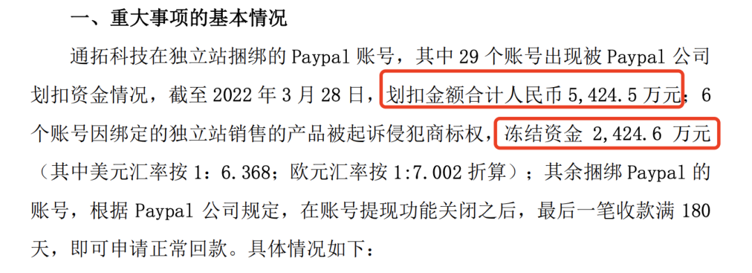 PayPal手起刀落,直接划扣5424.5万、冻结2424.6万。据通拓母公司ST华鼎公告,通拓在独立站捆绑的多个PayPal账号出现被资金划扣和冻结的情况,总计涉及金额高达7849.1万元,占公司2020年年末经审计货币资金的 8.09%。