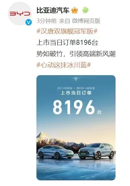 上市当日订单8196台。