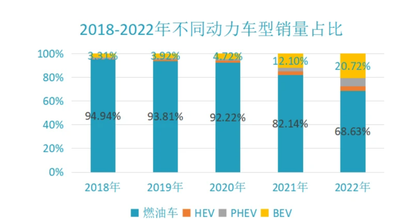 传统燃油车(乘用车)销量从2017年的2365万辆下滑至2022年的1488万辆,下滑幅度约36.84%。