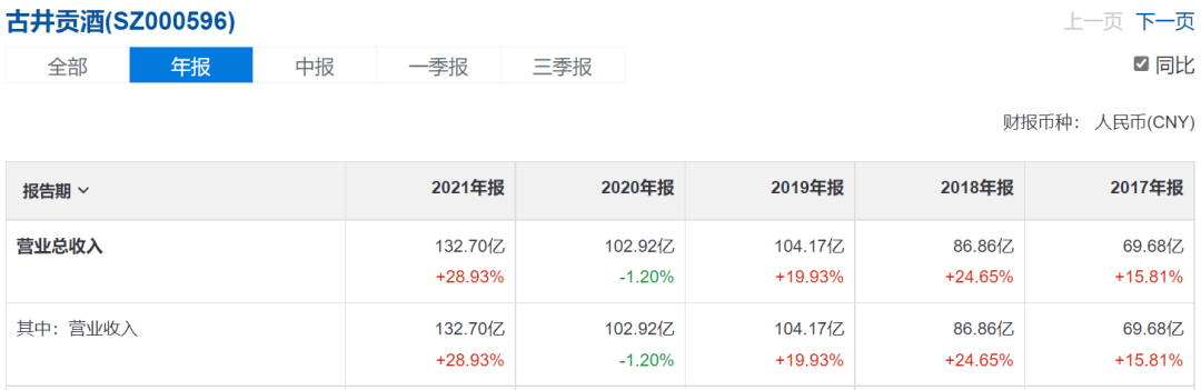 根据各公司年报显示,古井贡酒2021年全年营收132.7亿元,同比增长28.93%,净利润21.86亿元,同比增长23.9%。