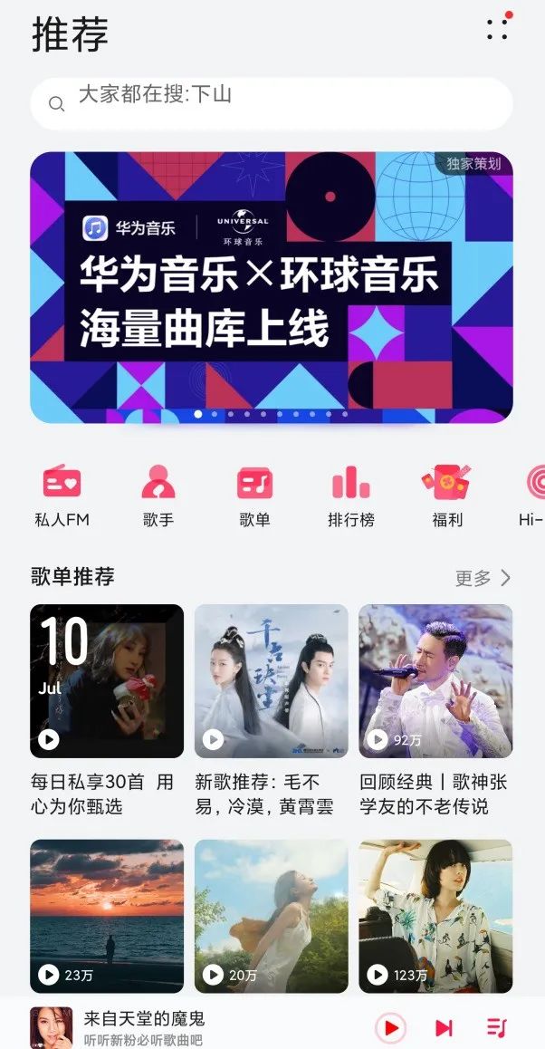 在不切APP听歌的时代真正来临之前,用户依然有更好的折中方案。相比TME和网易云坐拥众多的排他性资源,第三方音乐平台反而有不少共性资源。以华为音乐为例,虽然整体音乐数量还无法超越两家巨头,但曲库也算丰富,很多经典老歌新唱和新鲜出炉的热歌都能找到。