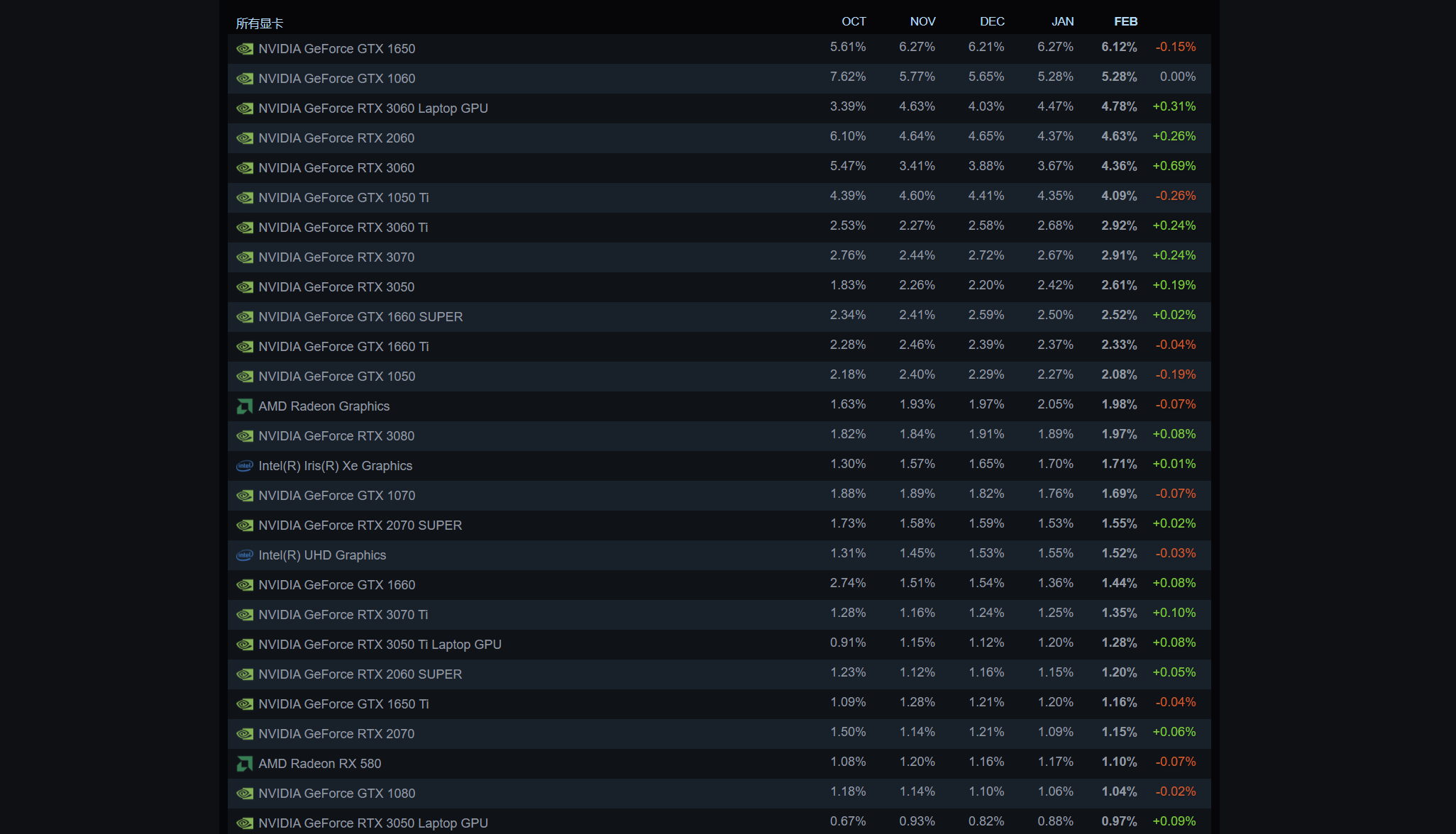 根据Steam最新统计显示,如今市场占有率最高的游戏显卡依旧是2019年发布的一款中端显卡,甚至占有率前十的显卡中也只有一张RTX 3070算得上是次旗舰显卡,足矣证明大多数消费者是不会去考虑那些高端显卡的。